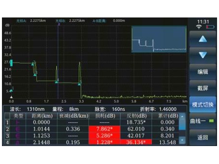 يحتاج المستخدمون فقط إلى مطابقة الألياف بمنفذ OTDR والنقر فوق الزر "اختبار" ، ثم يقوم OTDR تلقائيًا بتعيين حالة اختبار مناسبة وعرض نتائج الاختبار، بما في ذلك منحنيات الاختبار وقوائم الأحداث.