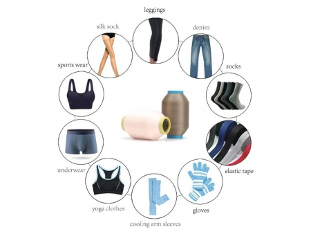 - ملابس رياضية عالية الأداء: خيوط إسباندكس مغلفة بالنايلون، والمعروفة بمرونتها الاستثنائية، يوصى بها بشدة للملابس الرياضية مثل ملابس الركض،السراويل الرياضية، حمالات الصدر الرياضية والداعمة.