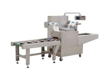 4. توضع الأكياس في حجرة آلة التفريغ العوائي والتي تقوم بتعبئة الكيس عند إستخراج قدر معين من الهواء من الكيس المفرغ. آلة التفريغ مصنوعة من فولاذ مقاوم للصدأ ومتوفرة في تشكيلة من الأحجام والمواصفات، ومعدات الغسل بالغاز وغيرها.