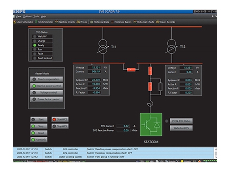جهاز STATCOM وهو عبارة عن هيكل متتالي متصل مباشرةً بقضيب التوصيل بجهد 13.8 كيلو فولت، وأهداف التحكم هي عامل القدرة والتوافقيات.