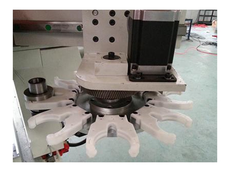 ماكينة الراوتر CNC هذه مجهزة مع وحدة تغيير الأدوات التلقائية من النوع القرصي، والتي تتمكن من تغيير الأدوات بسرعة تبعا لحركة عمود الدوران، مما يحقق الأعمال المتعددة مثل الحفر، القص والثقب. يتم استخدام ماكينة سي أن سي هذه على نحو واسع لتصنيع الأثاثات الخشبية، الديكورات المعمارية والأشياء الأخرى. وظيفة تغيير الأدوات السريع يقلل وقت التجهيز إلى حد كبير.